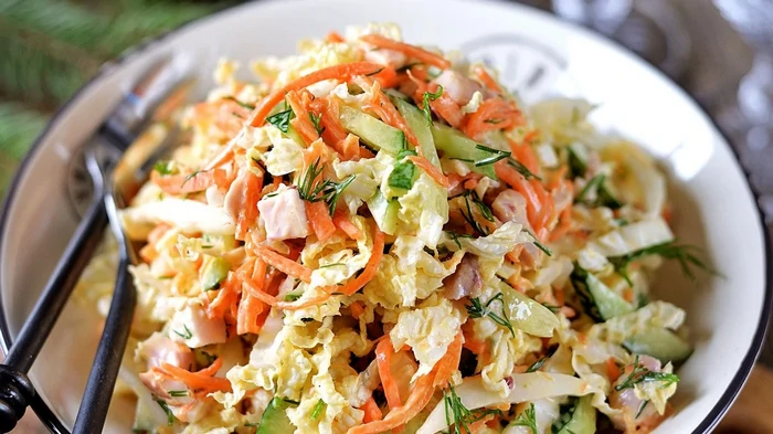 - Pekino kopūstą, morkas, agurką, kiaušinių baltymus, žoleles sudėkite į dubenį, pasūdykite, švelniai išmaišykite, pagardinkite padažu ir vėl išmaišykite.