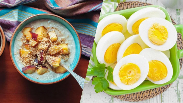 Kiaušiniai yra turtingas baltymų šaltinis, turintis minimalų angliavandenių kiekį, o avižiniai dribsniai turi daug angliavandenių ir mažai baltymų.