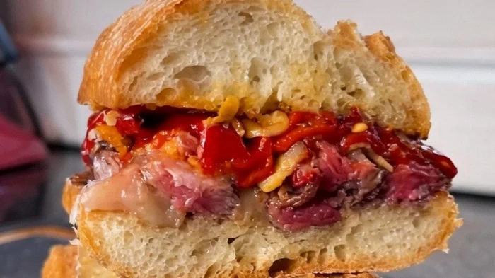 - Sudėkite antrekotą, suberkite pikilio pipirus, truputį česnako ir pašlakstykite alyvuogių aliejumi. Rezultatas – sumuštinis su traškia plutele, minkštos tekstūros viduje ir sodraus skonio.