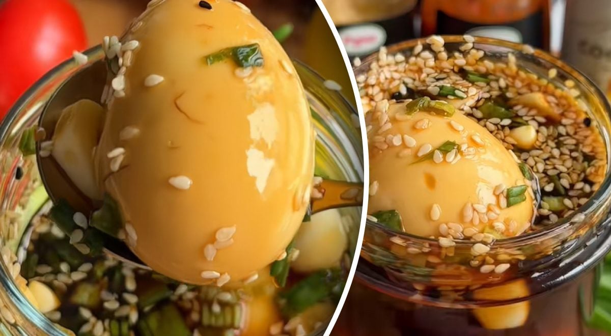 Smulkiai pjaustytus žalius svogūnus, sojų padažą, vandenį, česnaką, sezamo sėklas ir aštrų padažą sumaišykite stiklainyje. Tada įmuškite kiaušinius į marinatą, uždarykite stiklainį ir padėkite į šaldytuvą 6 valandoms.